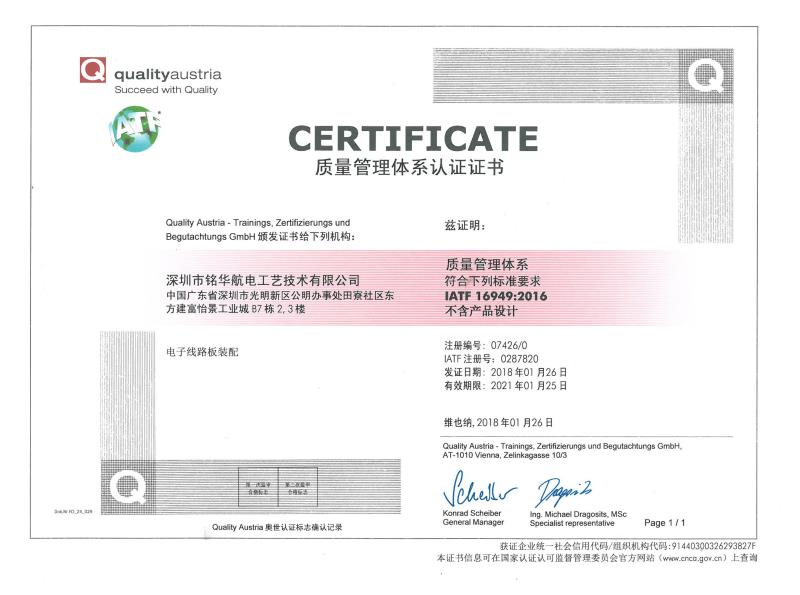 銘華航電取得電子線路板裝配 IATF16949:2016 質(zhì)量管理體系認證證書的公告